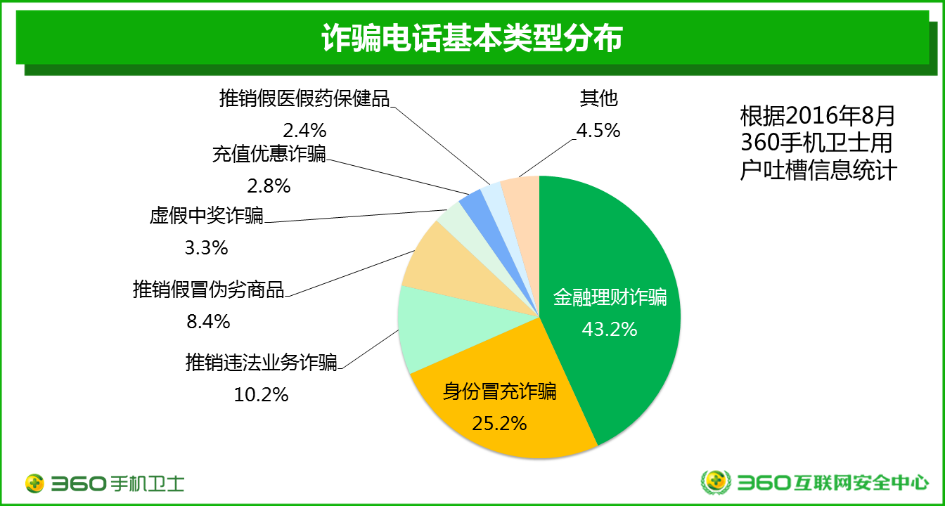 9月7日,360在京發(fā)布了國(guó)內(nèi)首份基于大數(shù)據(jù)研究的電信詐騙分析報(bào)告——《2016中國(guó)電信詐騙形勢(shì)分析報(bào)告》。報(bào)告中顯示,在用戶接到的所有詐騙電話中,虛假的金融理財(cái)詐騙最多,占43.2%,此類詐騙在北上廣深等大城市尤其盛行。其次是身份冒充詐騙,占25.2%。各類虛假的業(yè)務(wù)推銷電話也是被用戶大量吐槽的詐騙電話類型。