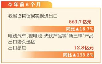 本報(bào)訊(記者孟婷)7月31日,記者從太原海關(guān)獲悉,據(jù)統(tǒng)計(jì),今年前6個(gè)月,我省貨物貿(mào)易實(shí)現(xiàn)進(jìn)出口863.7億元,同比增長(zhǎng)18.7%,與此同時(shí),電動(dòng)汽車(chē)、鋰電池、光伏產(chǎn)品等“新三樣”產(chǎn)品出口勢(shì)頭迅猛,出口總額12.8億元,同比增長(zhǎng)135.8%,遠(yuǎn)超傳統(tǒng)出口商品。這些高科技產(chǎn)品不僅代表山西制造業(yè)轉(zhuǎn)型升級(jí)的最新成果,也為山西在國(guó)際市場(chǎng)競(jìng)爭(zhēng)中贏得了新優(yōu)勢(shì)。