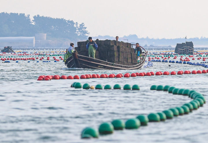在山東省榮成市愛(ài)倫灣海域,鮑魚養(yǎng)殖戶駕駛滿載鮑魚的漁船返回(2024年9月11日攝)。新華社發(fā)(李信君攝)