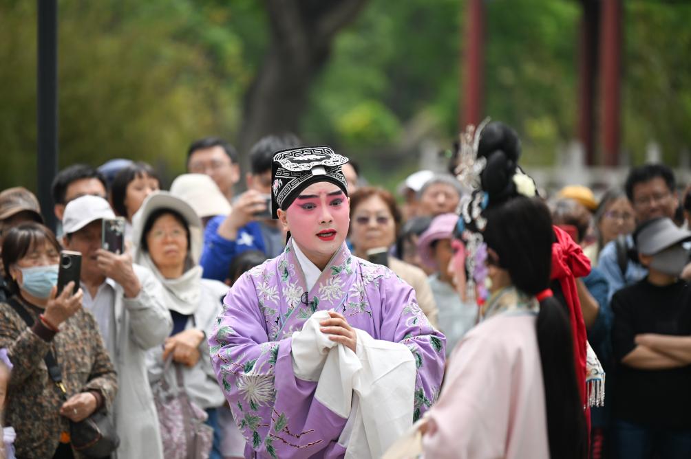 5月5日,演員在天津人民公園為觀(guān)眾表演京劇《西廂記》。新華社記者 孫凡越 攝