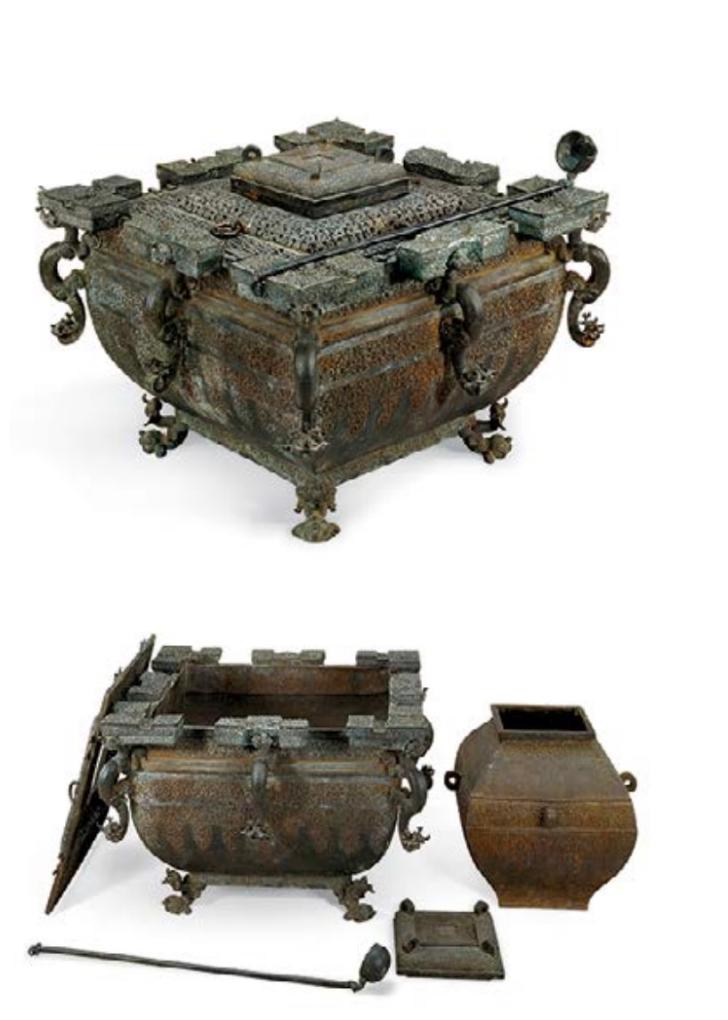 影片中用于冰酒的銅鑒缶正是出自于湖北省博物館館藏曾侯乙銅鑒缶,它由外部的鑒、鑒內(nèi)置的缶組成,是中國最早的“冰箱”。在鑒的內(nèi)部放上缶,中間的空隙放上冰塊,可在祭祀和宴饗時冰鎮(zhèn)酒?!耙怨艦殍b”“擊缶而歌”等成語亦由此衍生而來。