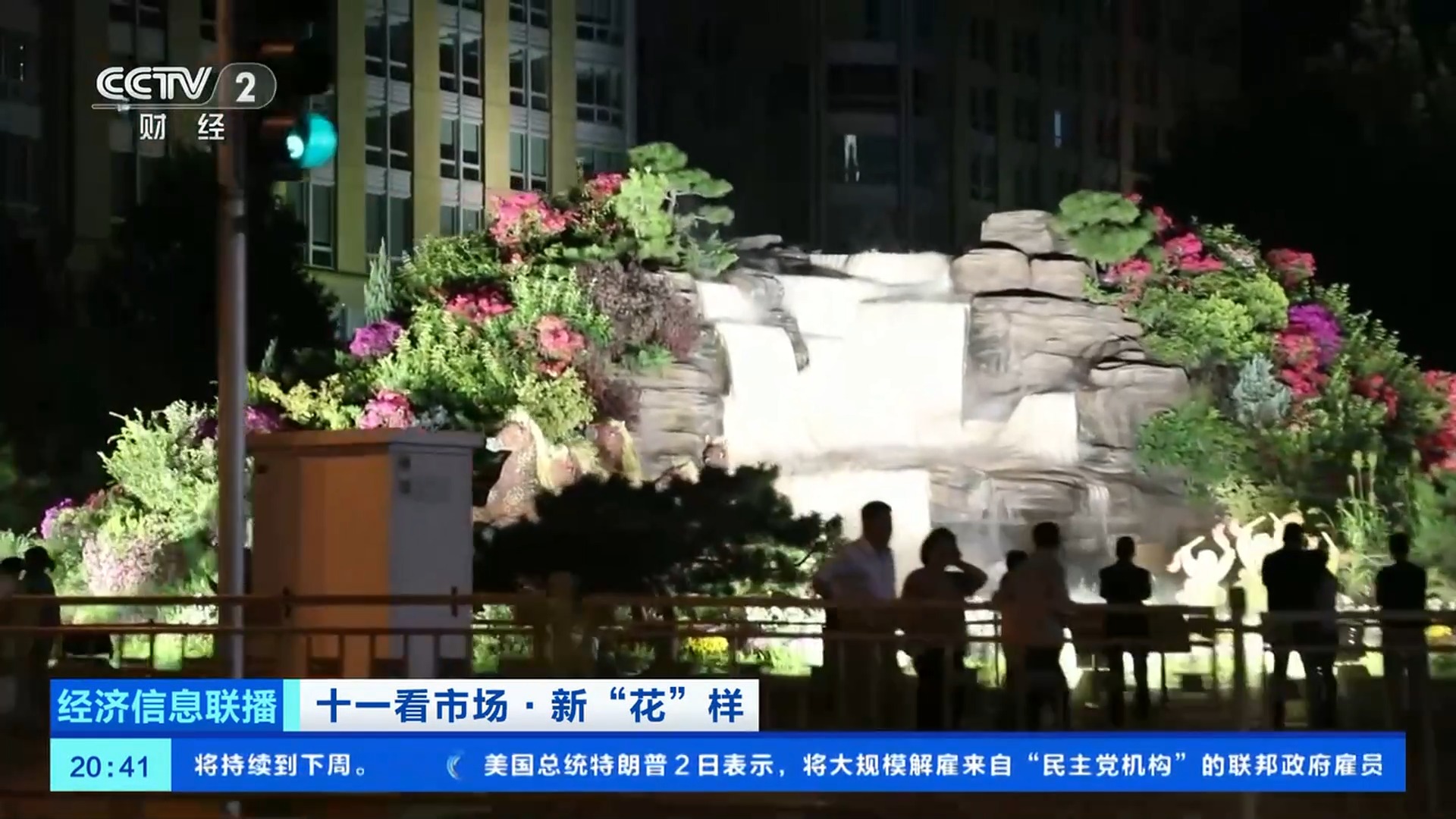 總臺(tái)央視記者 王聞聰:今年北京天安門(mén)廣場(chǎng)中心花壇的大花籃和長(zhǎng)安街沿線的10組立體花壇,都在國(guó)慶中秋假期增添了夜間照明設(shè)施,讓夜晚的花壇更加引人注目。北京東單東南角的“黃河贊歌”立體花壇,也被稱為是“會(huì)唱歌的花壇”。在花壇上不僅能看到微觀的壺口瀑布、奔騰的駿馬、載歌載舞的人群,還有水霧、音樂(lè)等聲光電技術(shù),更加逼真地還原了黃河之水天上來(lái)的氣勢(shì)。晚上八點(diǎn),這里仍有大量游客前來(lái)拍照打卡。