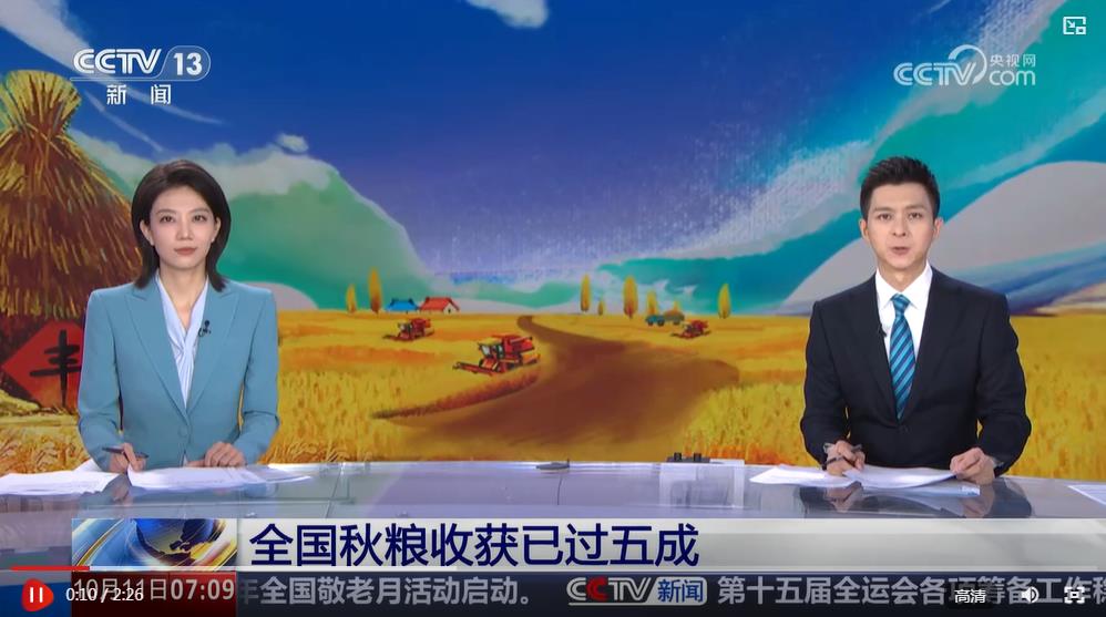 央視網(wǎng)消息:據(jù)農(nóng)業(yè)農(nóng)村部最新消息,截至10月10日,全國秋糧收獲已過五成。分作物看,中稻收獲近六成,玉米過五成,大豆五成半,雙季晚稻零星收獲。