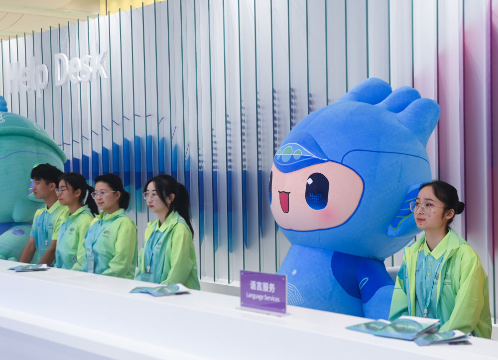 2023年9月1日,志愿者們?cè)诤贾輥嗊\(yùn)會(huì)期間工作。新華社記者 徐昱 攝