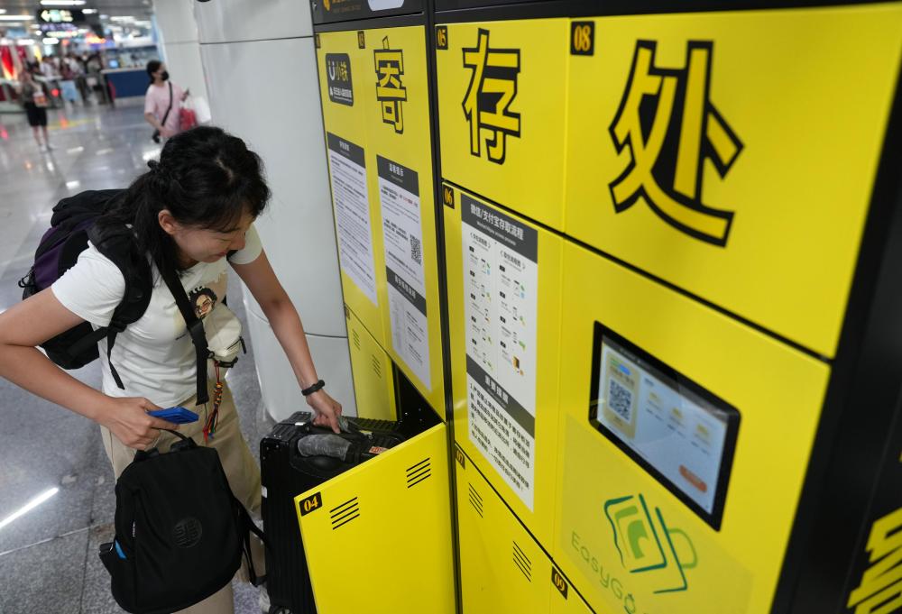 2024年9月2日,一名來(lái)自北京的游客將行李存入杭州地鐵5號(hào)線城站站的自助寄存柜內(nèi)。新華社記者 韓傳號(hào) 攝