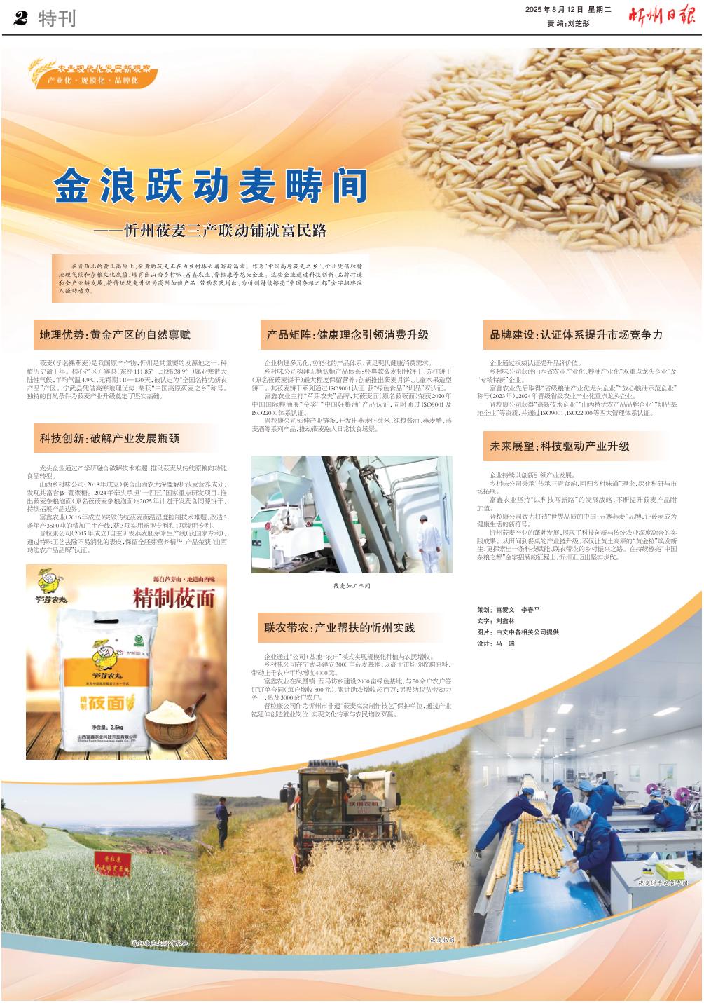 在晉西北的黃土高原上,金黃的莜麥正在為鄉(xiāng)村振興譜寫(xiě)新篇章。作為“中國(guó)高原莜麥之鄉(xiāng)”,忻州憑借獨(dú)特地理氣候和雜糧文化底蘊(yùn),培育出山西鄉(xiāng)村味、富鑫農(nóng)業(yè)、晉??档三堫^企業(yè)。這些企業(yè)通過(guò)科技創(chuàng)新、品牌打造和全產(chǎn)業(yè)鏈發(fā)展,將傳統(tǒng)莜麥升級(jí)為高附加值產(chǎn)品,帶動(dòng)農(nóng)民增收,為忻州持續(xù)擦亮“中國(guó)雜糧之都”金字招牌注入強(qiáng)勁動(dòng)力。