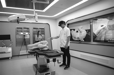 在位于安徽省蕪湖市的“中國視谷”,工作人員在模擬手術室里演示數字化手術輔助平臺。新華社發(fā)(肖本祥 攝)