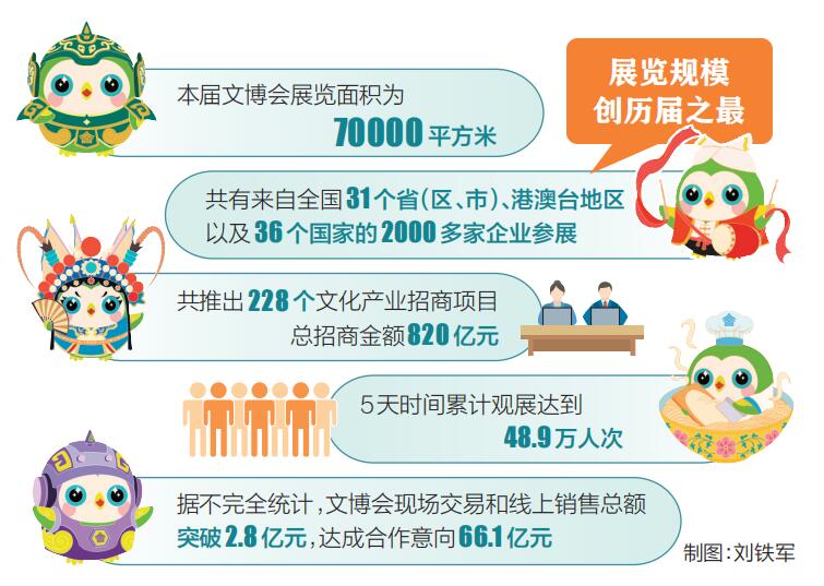 本屆文博會(huì)展覽面積為7萬平方米,共有來自全國31個(gè)?。▍^(qū)、市)、港澳臺(tái)地區(qū)以及36個(gè)國家的2000多家企業(yè)參展,展覽規(guī)模創(chuàng)歷屆之最。共推出228個(gè)文化產(chǎn)業(yè)招商項(xiàng)目,總招商金額820億元,5天時(shí)間累計(jì)觀展達(dá)到48.9萬人次。據(jù)不完全統(tǒng)計(jì),文博會(huì)現(xiàn)場交易和線上銷售總額突破2.8億元,達(dá)成合作意向66.1億元。通過打造集視覺、聽覺、互動(dòng)體驗(yàn)與交易功能于一體的文化展示空間,舉辦“山西文化地標(biāo)”“山西文化科技融合發(fā)展”“山西省文化傳承發(fā)展”典型案例發(fā)布活動(dòng),全方位、立體式展現(xiàn)了三晉文化的獨(dú)特魅力,為推動(dòng)全省文化繁榮和經(jīng)濟(jì)社會(huì)高質(zhì)量發(fā)展注入了強(qiáng)勁動(dòng)力。