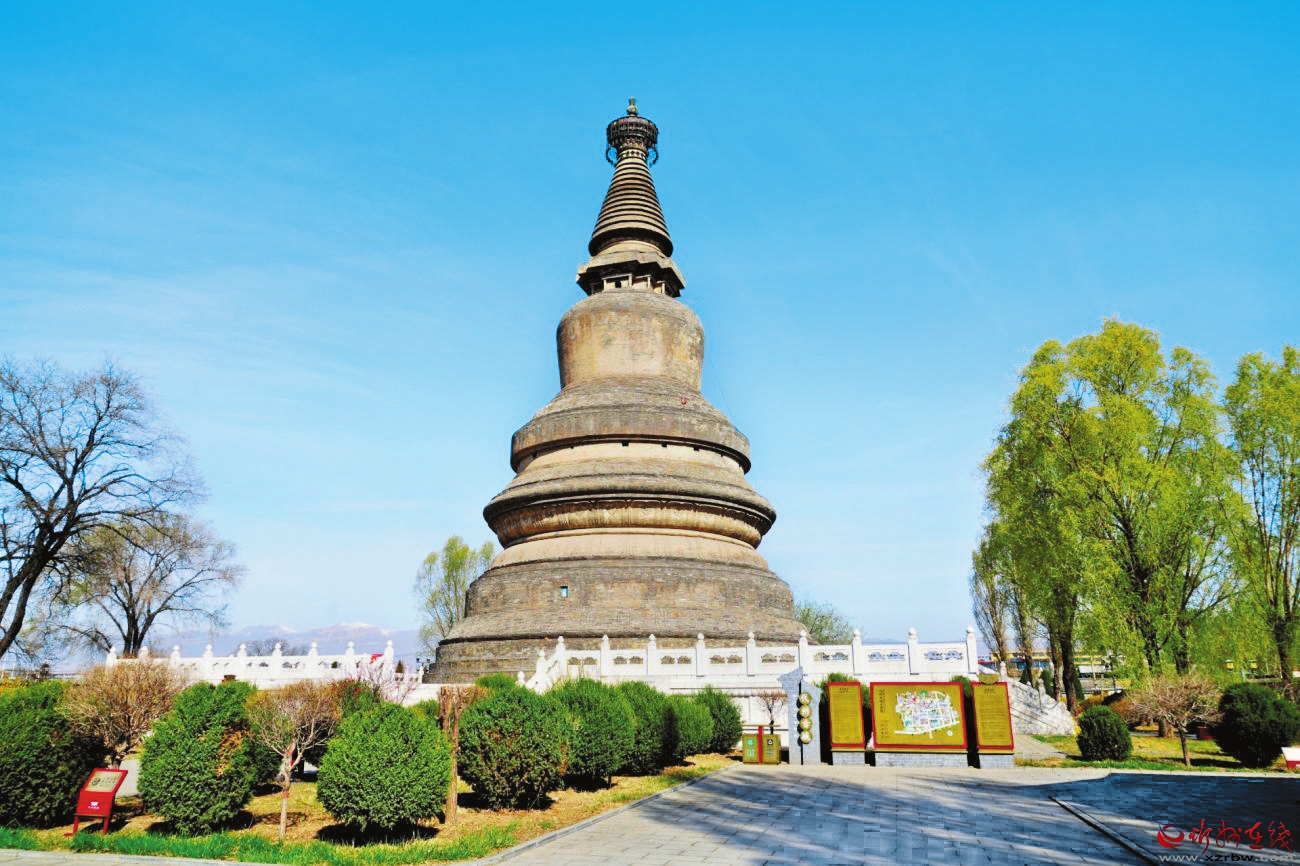 阿育王塔位于代縣上館鎮(zhèn)東北街村東大街北縣政府后院。據《代縣志》記載,原為圓果寺內建筑,1937年日軍拆毀寺院,僅存磚塔。該塔始建于隋仁壽元年(601年),初為木結構,唐會昌五年(845年)“滅法”時被毀,唐大中元年(847年)、宋元豐三年(1080年)、崇寧元年(1102年)重建,元至元十二年(1275年)改建為磚塔。該塔為喇嘛式磚塔,通高40米,占地面積1876平方米。塔平面呈圓形,磚石砌臺基,底徑20米,高1.5米。臺基上設束腰基座,刻有仰覆蓮瓣及纏枝花紋。塔身為圓形覆缽,塔剎分為剎座、相輪、傘蓋和寶珠,剎座須彌式,座中心矗立1根鐵質剎桿,砌相輪十三層,上置圓形露盤,狀為傘蓋,極頂置寶珠,上下疊置。2001年公布為全國重點文物保護單位。