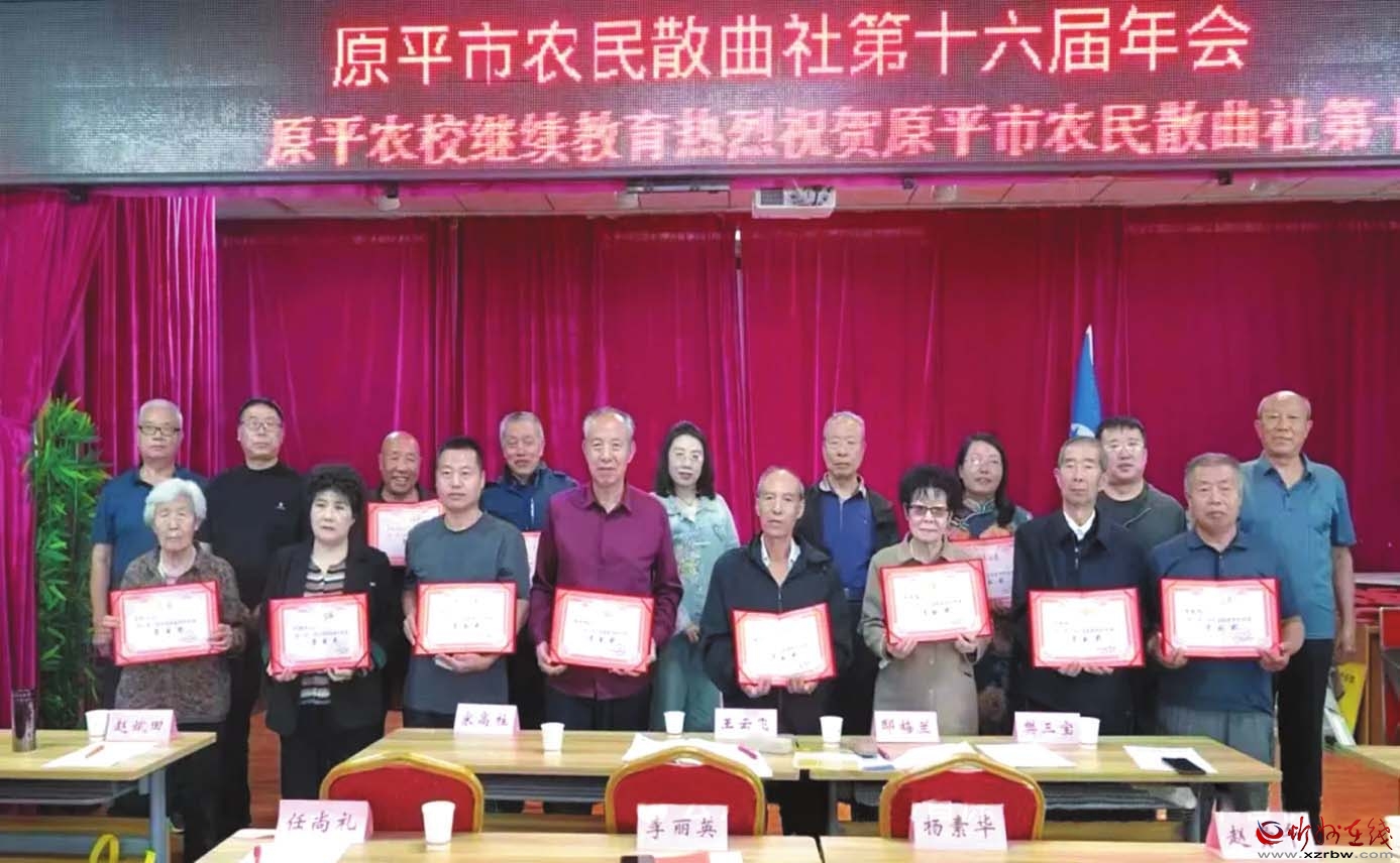 散曲社朗誦部的曲友們?cè)谟茡P(yáng)音樂(lè)聲中,激情澎湃地朗誦著五谷飄香的農(nóng)民散曲,20多名優(yōu)秀社員受到表彰,展示出原平農(nóng)民散曲的喜慶豐收景象?!霸?shī)如潮,農(nóng)民種曲名聲在,情如火,南腔北調(diào)心澎湃。曲如海,同舟共濟(jì)承傳愛(ài),暖如春,一年四季花不敗?;ㄩ_(kāi)滿地鮮,曲韻熔天籟,好一個(gè)震驚曲界田園派。”這首散曲《正宮·塞鴻秋》道出了散曲社社員們的心聲。