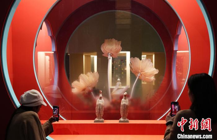 據(jù)介紹,這是蛇類紋飾作為裝飾題材出現(xiàn)在商周青銅禮器之上的一種典型代表。半人半蛇的唐代“伏羲女媧像立幅”帛畫,印證著伏羲女媧這一久遠的文化信仰,通過絹帛畫形式在當時的吐魯番地區(qū)傳播,并吸引其他民族的崇奉。此外,展廳中充滿新春氛圍感的桃花洞釉燈籠瓶、白玉“天官賜?!迸?、“好酒”白釉盤等近200余件(套)館藏文物精品,書寫著對即將到來的蛇年新春的期待和祝福。