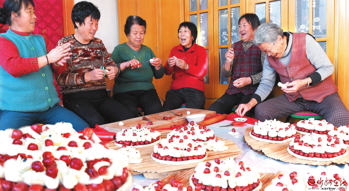 “臘八節(jié)”拉開了過年的序幕,臘月二十三,又稱“小年”。臨近年根,置辦年貨、洗洗涮涮,人們掃家除塵盡可能提早在臘月二十三前完成。為了飽享年節(jié)的輕松美好,在忻州民間有正月里不蒸灶的說法,人們要將年后一整個(gè)正月內(nèi)的所有主食集中在臘月加工制熟。過去,由于忻州小麥種植有限,唯獨(dú)過年才有口福享受幾頓白面食品,所以面食蒸灶是一件必不可少的事情。饃饃、花糕、棗山、錢龍,有女兒的還要有毛籃兒。上午蒸灶,下午搟豆面,這似乎也成為一種慣例。捏過花糕棗山的大面案依然還在炕邊擺著,把豆面和成硬硬的,搟得薄如紙張,折成幾折,切成一指寬左右的寬條,這是專為大年初一中午準(zhǔn)備的“寬心面”。
