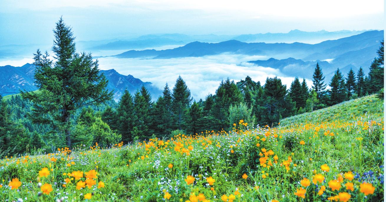駝梁地形四周封閉,中為谷地,形成了山巒綿亙、溝壑縱橫、河川橫跨東西的自然生態(tài)景觀(guān)。其主峰海拔2281米,為“晉冀兩省四縣”交匯處,駝峰山巒蜿蜒,此起彼伏,猶如“靜臥巨駝”而取名駝梁。與五臺(tái)山風(fēng)景名勝區(qū)東北相望,遙相呼應(yīng),有其獨(dú)特和不可替代之優(yōu)勢(shì),同為五臺(tái)山旅游資源亮點(diǎn)。由山谷到山頂分布著落葉林混交林帶、樺樹(shù)林帶、落葉松林帶,生物垂直分布變化明顯。駝梁頂部,有一片亞高山草甸,約近萬(wàn)畝的茵茵綠草,像碩大無(wú)比的地毯,與天際交接,一望無(wú)垠。隱于藍(lán)天白云和松林綠波之間,散落著漫山遍野的杜鵑花、金蓮花、百合花、燈籠花等,置身其間,如進(jìn)花海,恍若仙境。因位于云霧縹緲的高山之巔,故被人譽(yù)為“云頂花?!薄?/p>