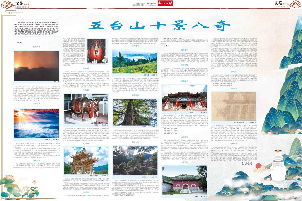五臺(tái)山十景八奇有新舊之別,史上形成的十景為:大社銅牛、玉花羅漢、碧山字塔、臺(tái)麓字崖、古佛牌樓、羅睺現(xiàn)佛、菩薩銅鍋、顯通銅殿、山西土地和五郎鐵棍;八奇為:佛洞轉(zhuǎn)生、摩崖造字、龍洞幻景、華嚴(yán)字塔、石罅映月、萬(wàn)年積冰、臺(tái)巔天池和清涼大石。這十景八奇歷經(jīng)滄桑更迭,有的現(xiàn)在不存在了,有的已經(jīng)殘破不堪。后經(jīng)一些學(xué)者長(zhǎng)期考察,比較研究,從眾多的文物景觀(guān)中篩選出一些世所罕見(jiàn)的能夠代表五臺(tái)山特色的奇景,謂之五臺(tái)山新的十景八奇。