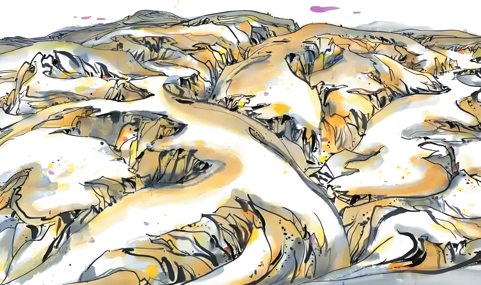 1989年10月的河曲寫生,是吳冠中藝術(shù)生涯的重要轉(zhuǎn)折點(diǎn)。在陪同的學(xué)生王秦生引導(dǎo)下,這位古稀老人尋找“黃土荒漠之典型地區(qū)”,最終駐足晉西北河曲縣。每日晨起,他面對(duì)被雨水沖刷、滿山皆溝壑的地貌,靜心思考,猛然產(chǎn)生了驚人的藝術(shù)聯(lián)想——起伏的山形如同眾多老虎,而那些溝壑恰似老虎皮毛上的斑紋。他在《出現(xiàn)老虎》一文中寫道:“我終于發(fā)現(xiàn)黃土高原是展拓了的老虎之群,其間伏臥著無數(shù)猛虎,有的正將躍起,有的還在酣睡。作完數(shù)幅黃土高原,意猶未盡,于是我畫起老虎來。”這種將地理特征轉(zhuǎn)化為藝術(shù)創(chuàng)作標(biāo)志著吳冠中完成“從風(fēng)景寫生到精神寫意”的蛻變,其價(jià)值在于為現(xiàn)代中國(guó)畫開辟了根植本土、融貫中西的新路徑。一個(gè)月河曲翠峰山寫生之旅誕生的《老虎高原》,更以極富樂感的線條勾勒出這片土地精神的圖騰。