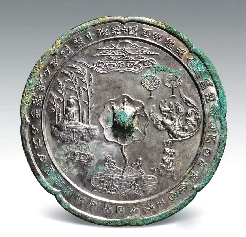 真子飛霜鏡一般都是圓形、葵花形,而西安出土的一面鏡形十分罕見,為亞字形。鏡背上方云海托月,半個月亮浮上來。真子飛霜鏡的形制,多在細節(jié)上略有差異。除了鏡鈕上方有“真子飛霜”四字,或者有一只飛翔的仙鶴之外,還有一種在鏡緣飾篆書體銘文,鏡銘為:“鳳凰雙鏡南金裝。陰陽各為配,日月恒相會。白玉芙蓉匣,翠羽瓊瑤帶。同心人,心相親,照心照膽保千春?!?/p>