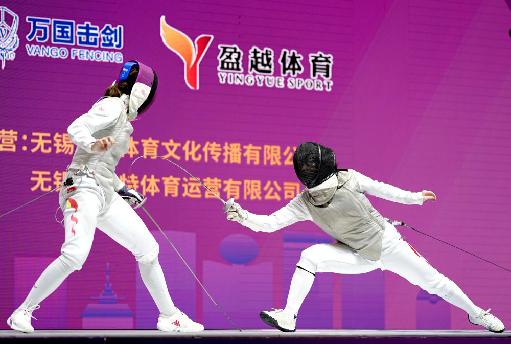 傅瑩瑩(右)與宋玥在女子花劍團體賽決賽中